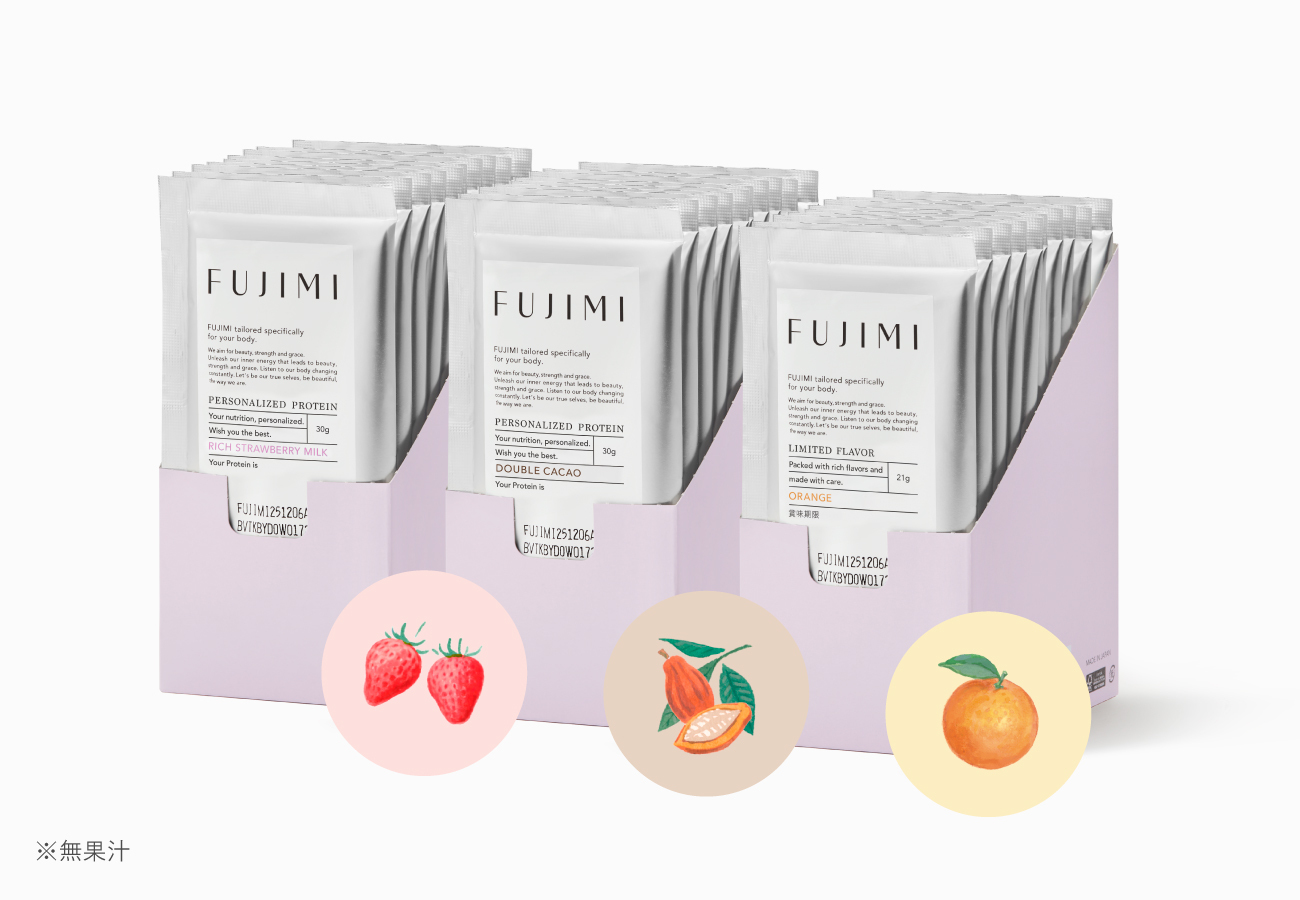 FUJIMIプロテインは独自のパーソナライズ分析からあなたの今のカラダ状態とライフスタイルに基づいて必要な栄養成分を豊富に配合したプロテインです。45種類以上の栄養成分からあなたにぴったりの成分を配合したプロテインをセレクトいたします。味はリッチストロベリーミルク、エクストラ抹茶ミルク、ロイヤルミルクティー、ダブルカカオ、トロピカルVC、コーンクリーム、ポテトクリーム、数量限定のオレンジ風味の8種類をご用意しております。