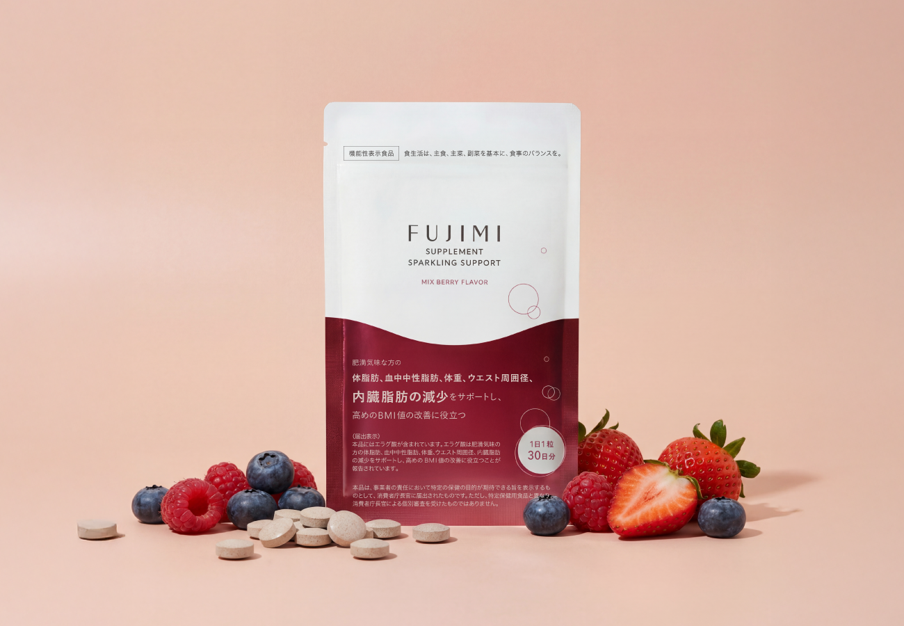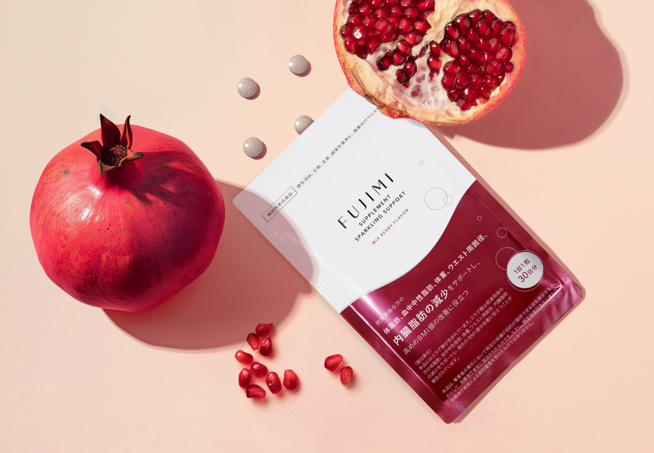 「FUJIMI サプリメント スパークリングサポート」には、ザクロ由来の「エラグ酸」を配合。エラグ酸は、肥満気味の方の体脂肪、血中中性脂肪、体重、ウエスト周囲径、内臓脂肪の減少をサポートし、高めのBMI値の改善に役立つことが報告されています。ファスティングで整えた身体を、科学的根拠に基づいてサポートします。